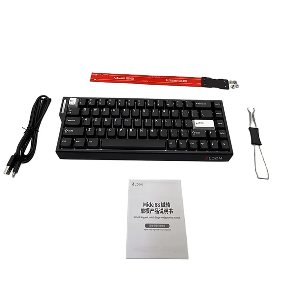USB-C cable for easy device connection, with customizable magnetic keys and a key remover tool.